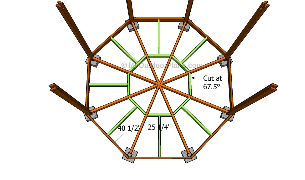 По аналогии с нижним основанием, верхняя обвязка состоит из 8 брусков, соединенных между собой под углом 135 градусов. Крепление осуществляется с помощью металлических уголков, которые фиксируют опорные столбы их обвязку. На фото ниже показано данное соединение.